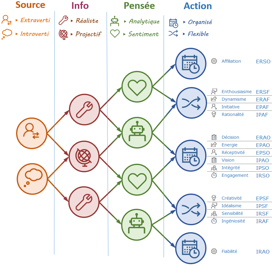 Après lecture des indications qui suivent, vous aurez un premier avis sur les propensions qui peuvent composer votre profil. Suivez le parcours fléché en sélectionnant pour chacune des 4 colonnes (Source, Info, Pensée, Action), la propension qui vous correspond puis retrouvez votre profil dans la page présentant les 16 profils.