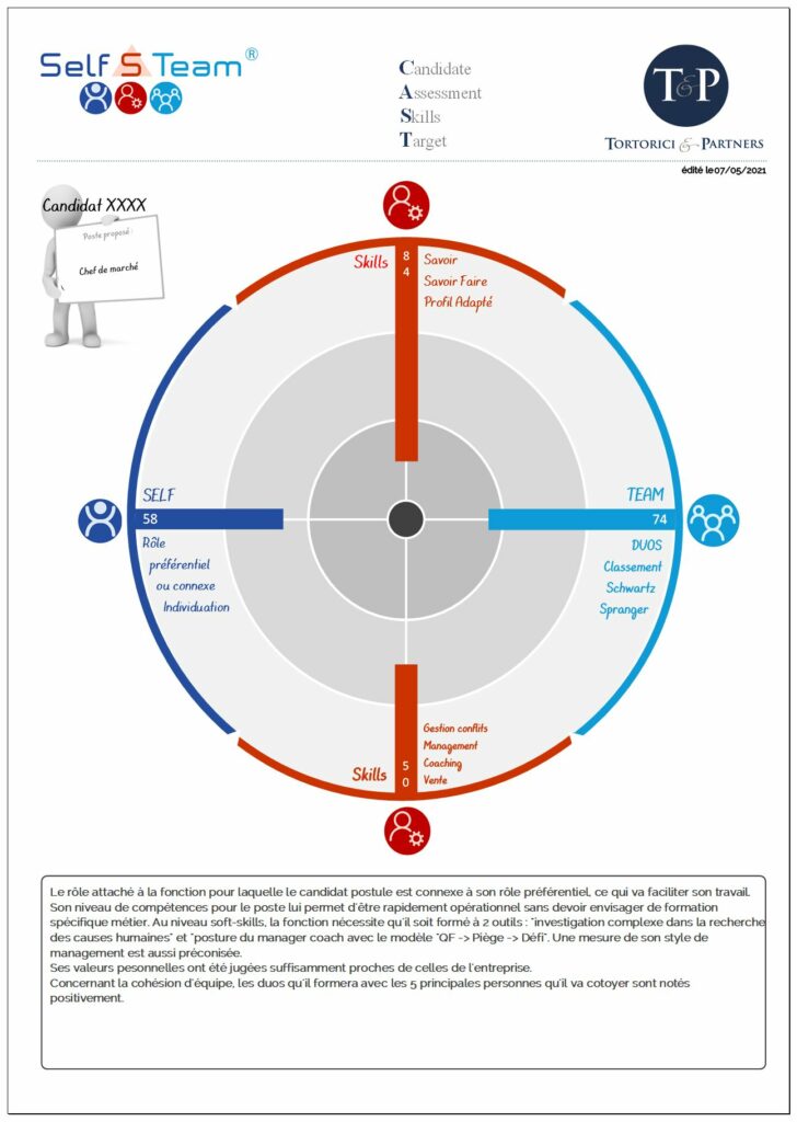 Le poste sur lequel porte le recrutement est rattaché à un des 8 rôles définis dans Self-S-Team® : INNOVATION • PROMOTION • DÉVELOPPEMENT • ORGANISATION • PRODUCTION • INSPECTION • SOUTIEN • CONSEIL. Le profil naturel de chacun prédestine à un de ces 8 rôles. Ce rôle va solliciter sur les propensions plutôt que sur les zones d’effort, ce qui est gage de succès car synonyme de confort pour travailler. Les rôles connexes sont aussi à privilégier car ils permettent de solliciter des zones d’effort susceptibles de faciliter la dynamique d’individuation (cf lexique). Le critère SELF indique le potentiel d’épanouissement lié à la fonction et aux missions proposées.